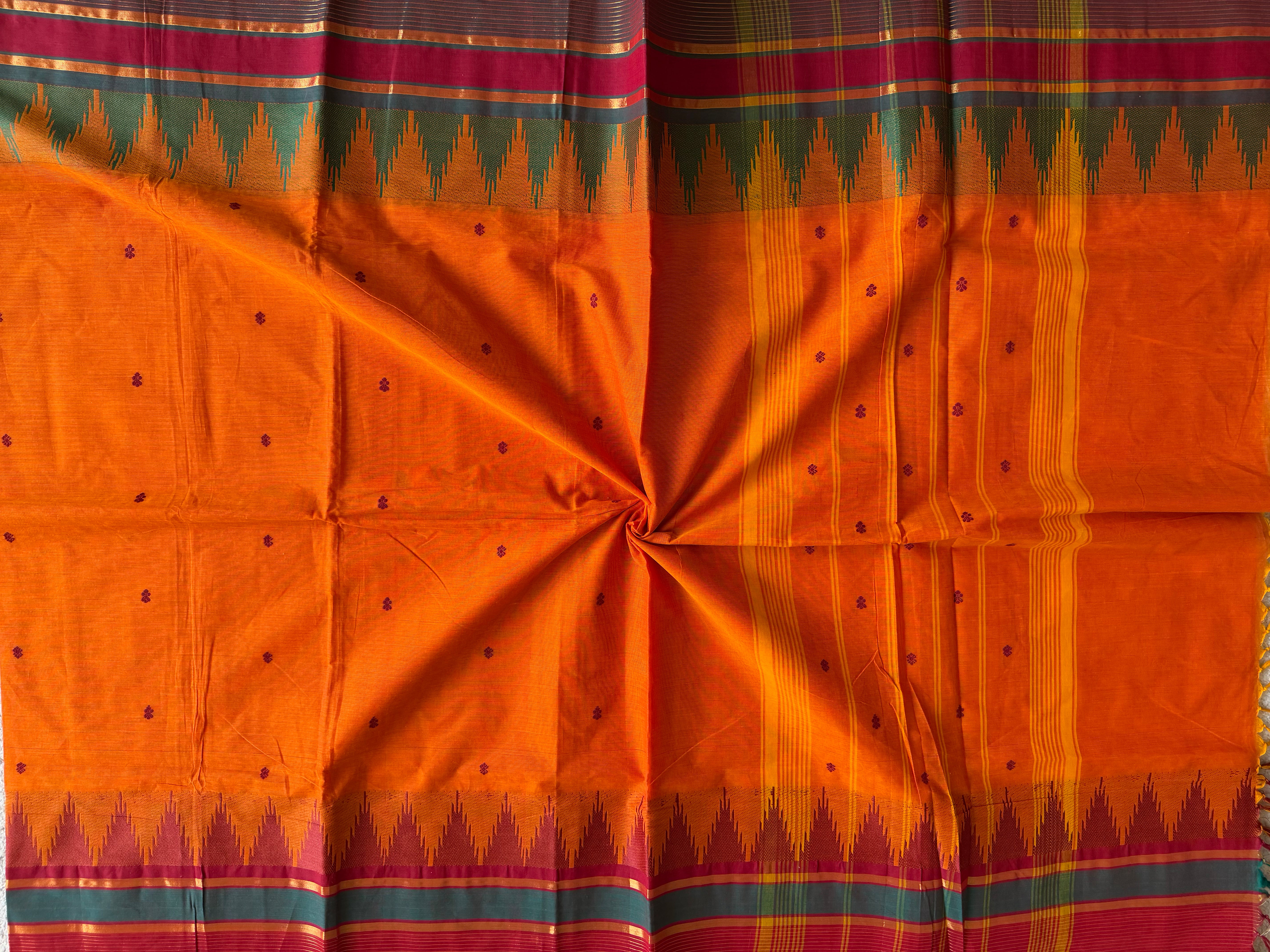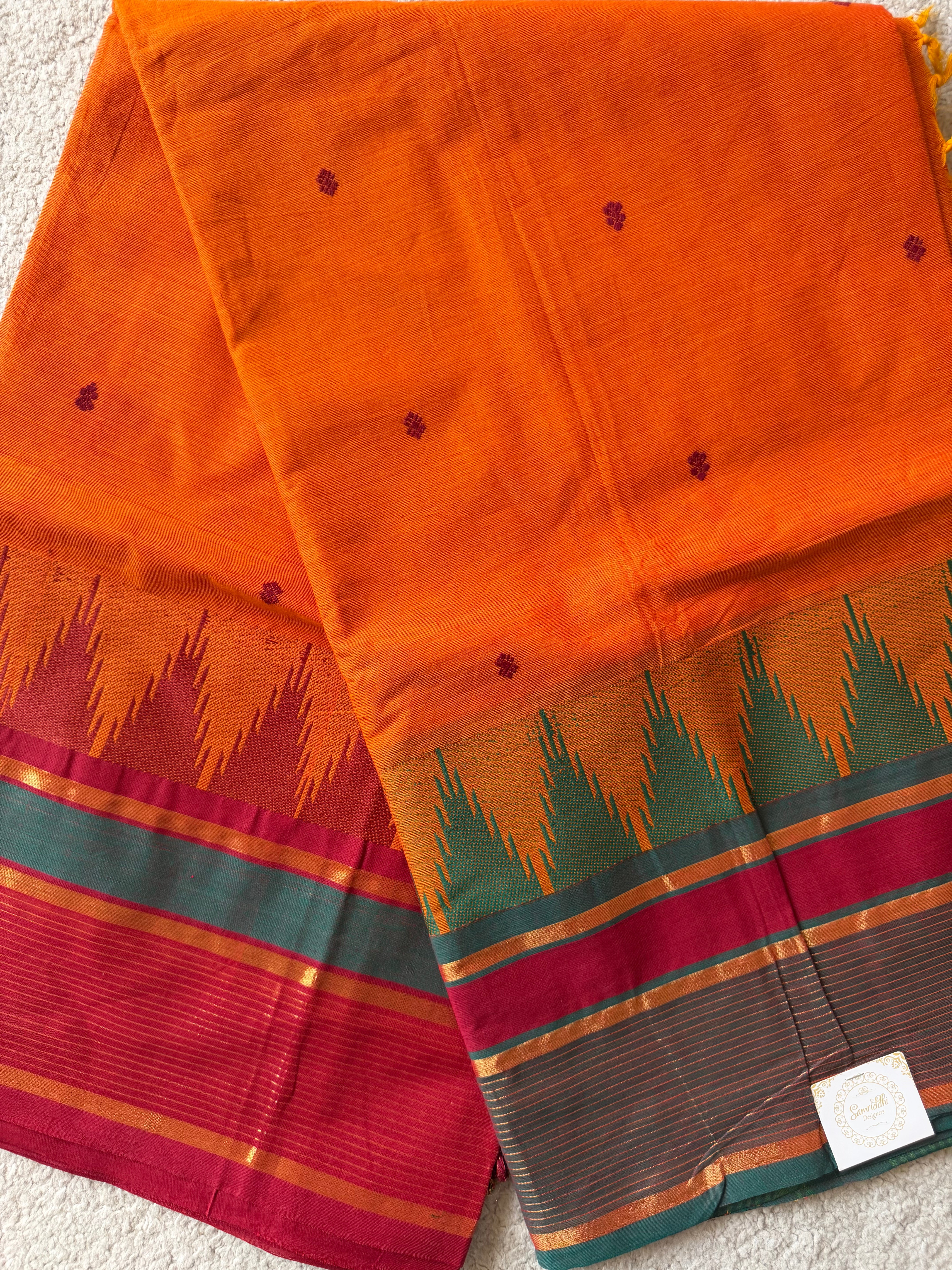 A radiant celebration of color and craftsmanship, the Dvandva Deepam Kanchi Cotton Saree features a rare dual-border design paired with a vibrant marigold-orange body, dotted with elegant maroon flower buttas.The bright color paired with minimalist motifs brings together tradition and contemporary simplicity. Soft, breathable, and traditionally woven, this saree carries the charm of South Indian temple traditions with a refreshing modern appeal.