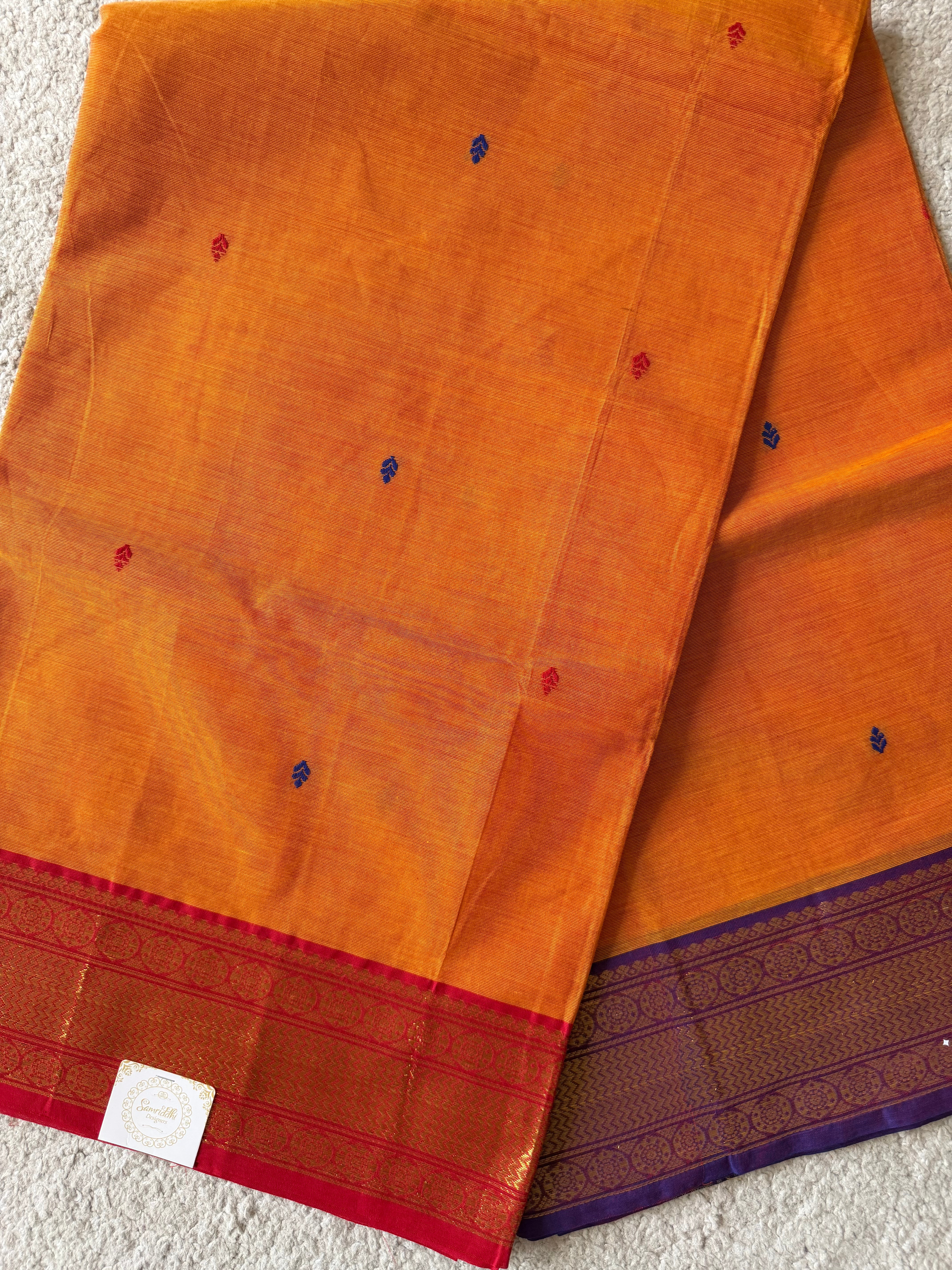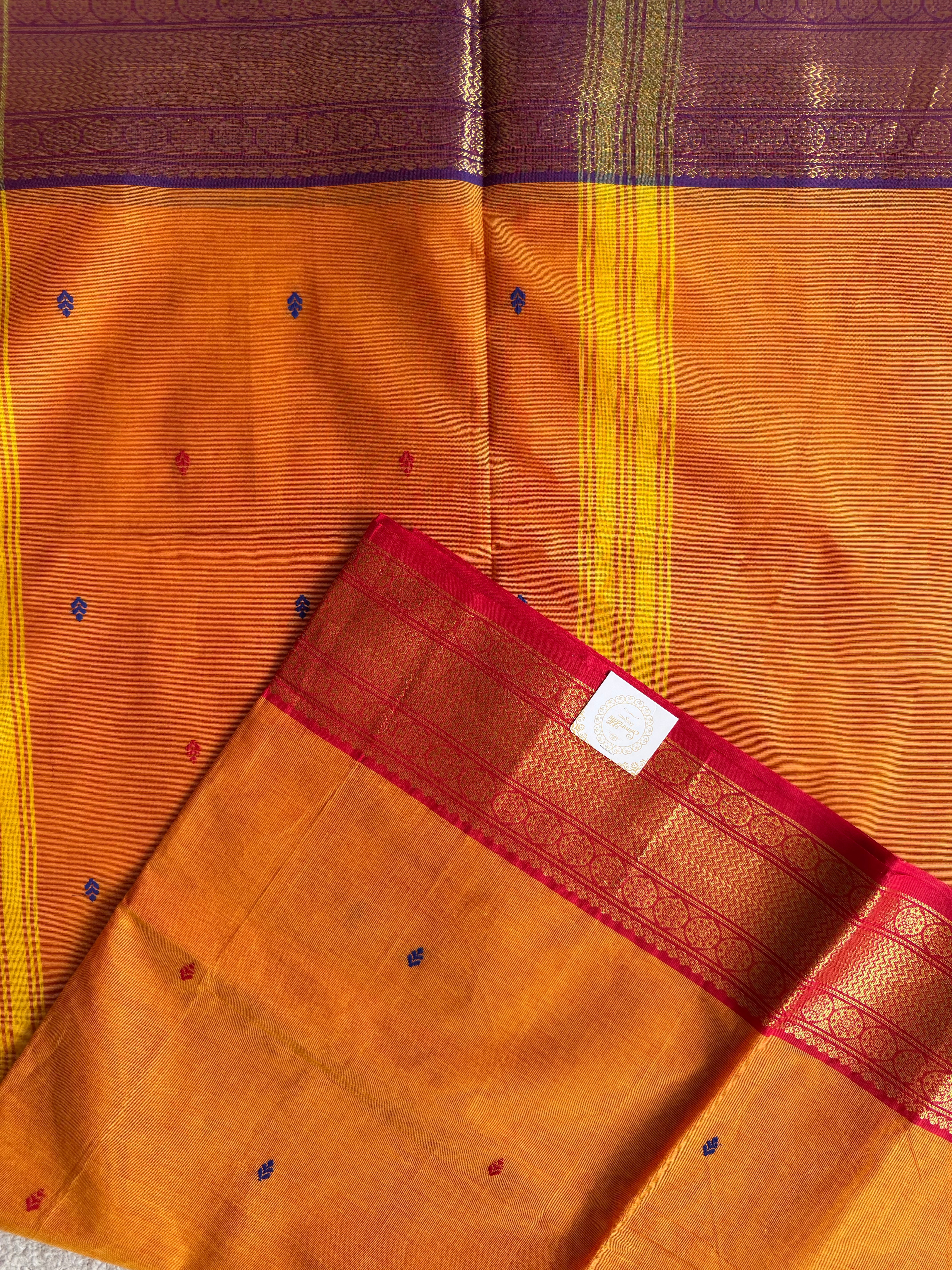 - Blouse: Plain Marigold with dual-border matching sleeve borders (Red + purple)