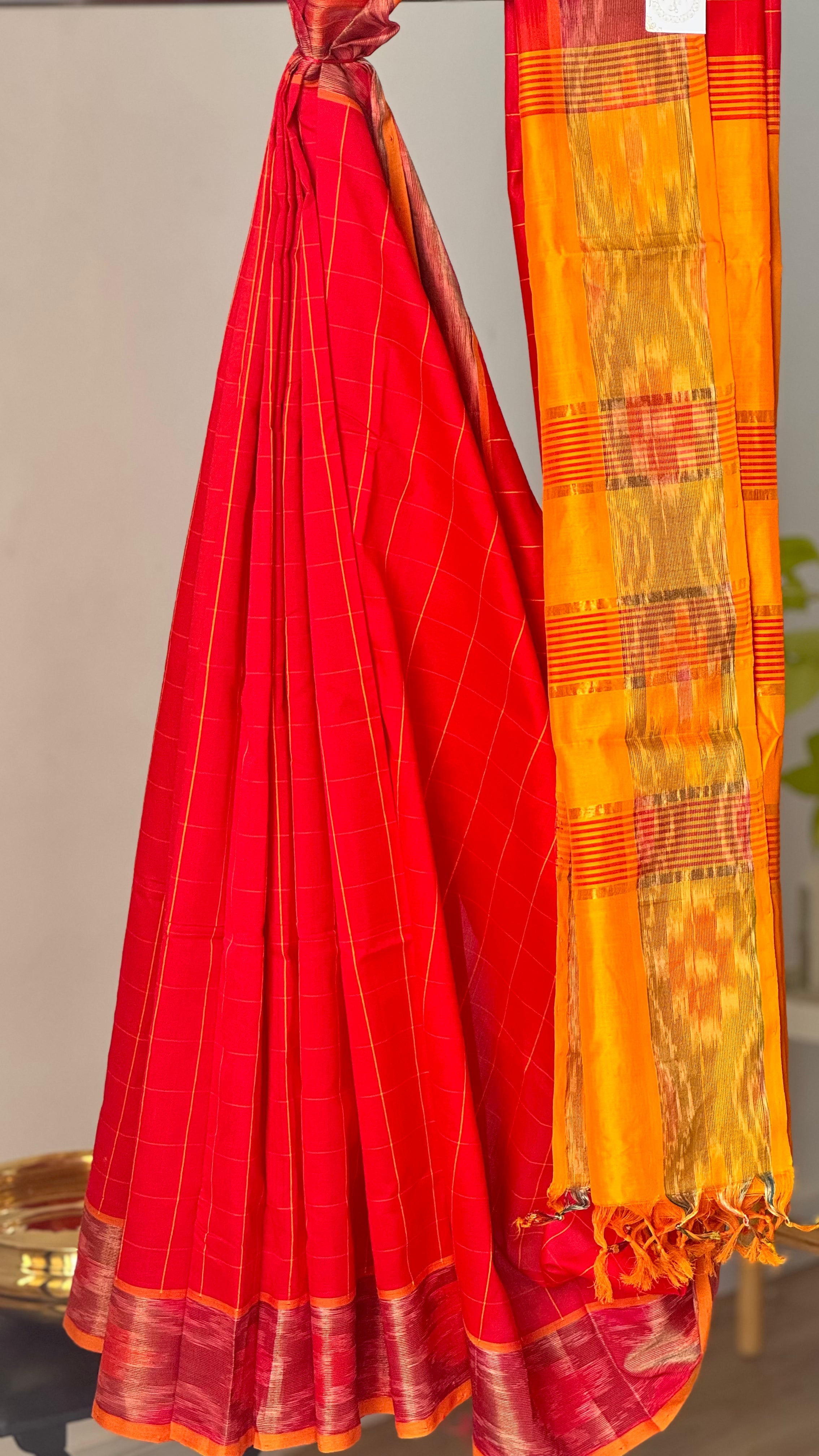 - Overall Pattern & Design: A vibrant saree featuring a red checked body paired with a yellow Ikat-style pallu beautifully enhanced by rich golden zari accents