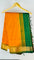 - Overall Pattern & Design: Rich, deep orange body with a contrasting emerald green pallu, elegantly enhanced by broad golden zari borders