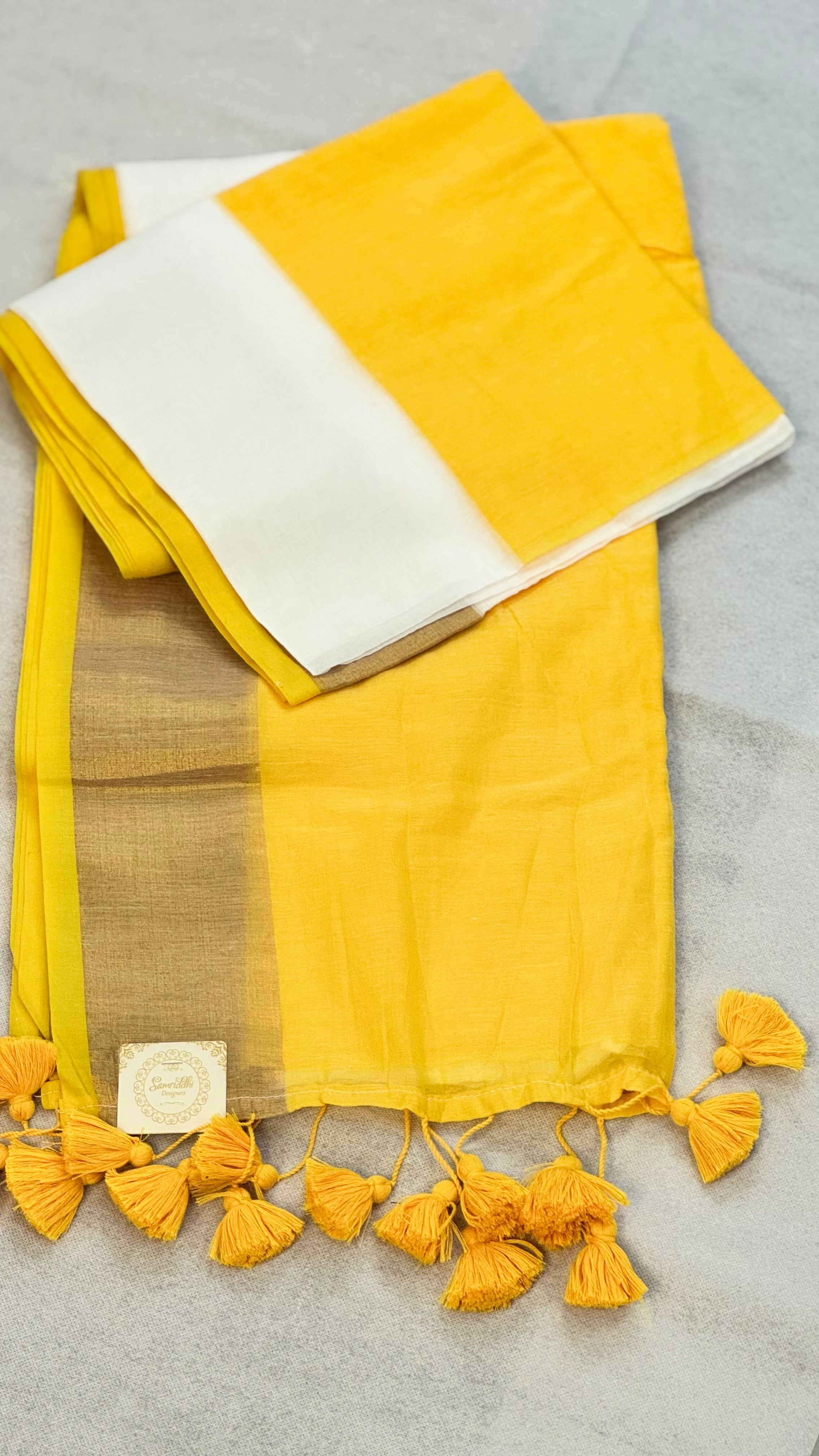 Surya Rekha-Yellow & White Mul Cotton saree with zari border tassels