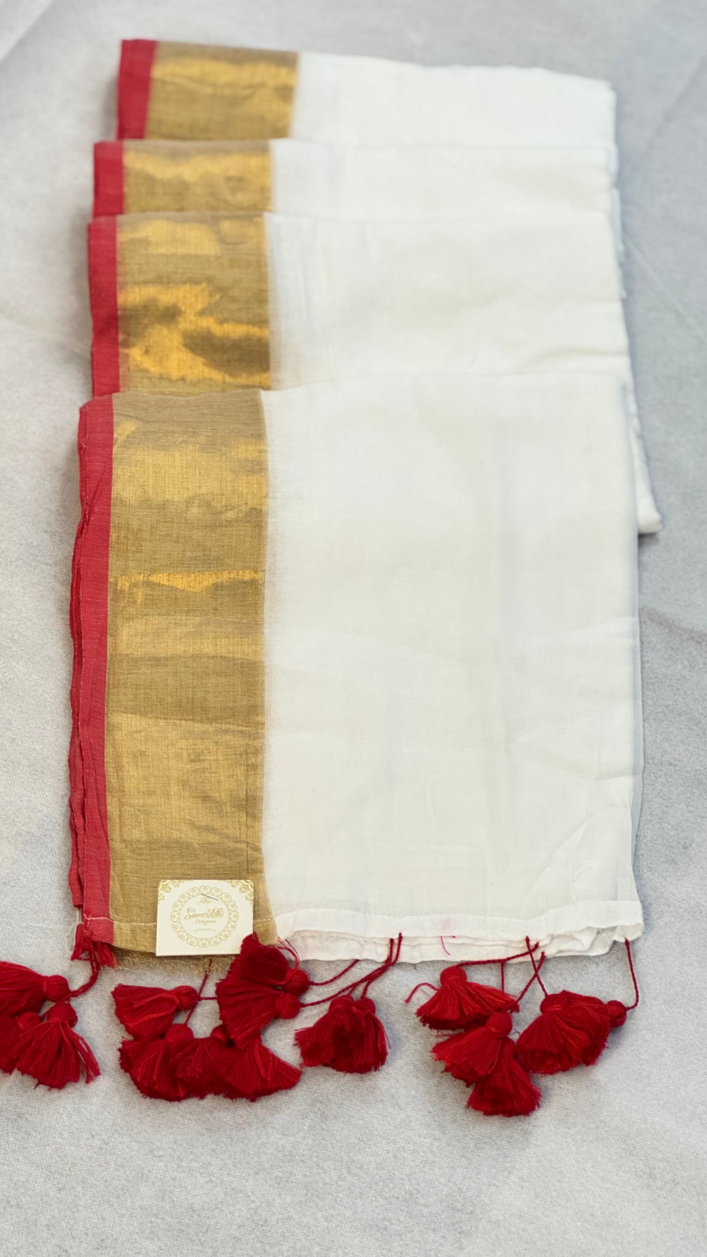Golden Scarlet - White Mul Cotton Saree with Red Border, Zari Stripe and Tassels